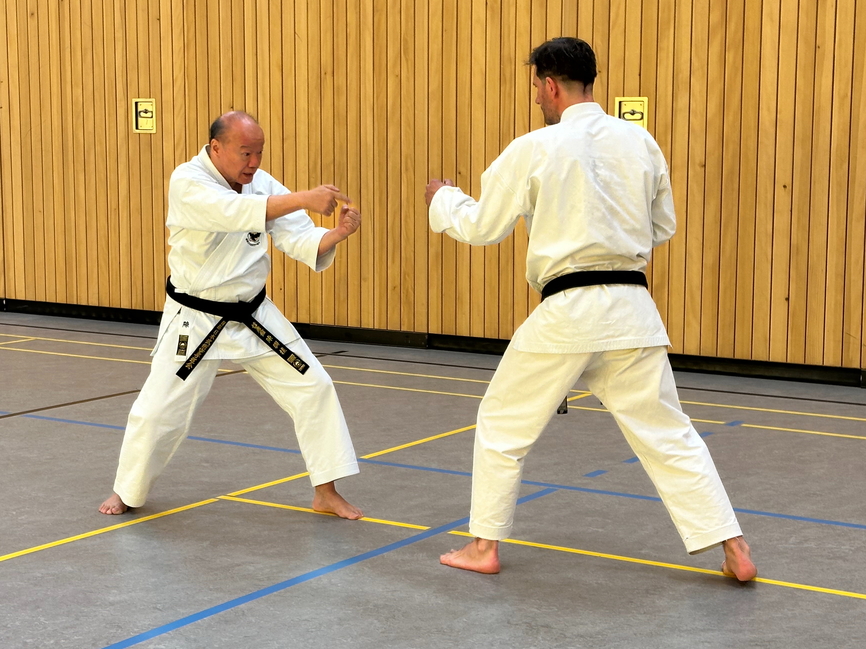 In partner exercises with sliding steps and subsequent counter, the sense of distance was trained and also timing played a big role. Kata was practiced too and besides well known Shotokan Kata like Heian Shodan, Jion and Kanku Dai Keibou Sensei teached the Asai Ryu Kata "Jo no Kata" which is an introducing kata to Karate ("Jo" means introduction). Also when practicing kata, Keibou Sensei pointed out a lot of little things that often don't get any attention but are crucial for the effectifity of the karate techniques.